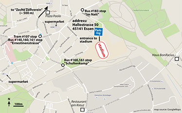 - Get out after 7 stops at Ernestinenstr. Walk into Hallostraße and follow the street signs to the stadium. Walking distance is around 5 minutes from the stop to the stadium.